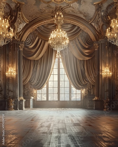 Grand ballroom with ornate details, large windows, and elegant drapery. Perfect for royalty and fairytale themes.