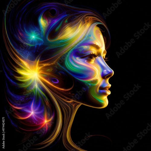Portret kobiety wykonany kolorową, neonową farbą i światłem. Wielobarwny zarys twarzy na czarnym tle