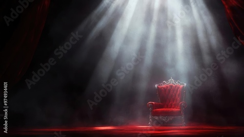 An elegant red throne illuminated by dramatic lighting and surrounded by mist, creating a captivating and mysterious atmosphere.