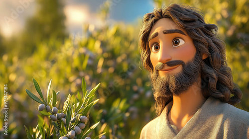 3d cartoon illustration of calm, peaceful, slightly smiling Jesus Christ against the background of an olive grove, Christianity, religion, God, lord, Catholicism, Orthodoxy, faith, believe, man