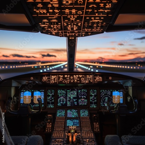 Illuminated airplane cockpit during sunset with a view of the runway, showcasing detailed instrumentation and navigation controls.