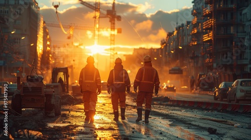 Landscape view of a highway under construction, with workers in uniform, wearing safety helmets, and papers on a table against road equipment and a blue sky with sun rays. High-resolution photography.