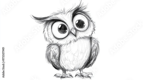 Cute and funny cartoon owl character sketch style black and white hand drawn 2D illustration isolated design