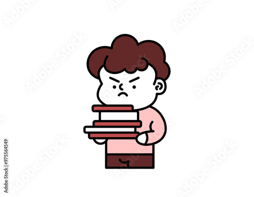 illustration of a male employee looking upset. feeling angry because he gets a lot of tasks. carrying a lot of books. workload and worker problems. cute character design outline style. elements