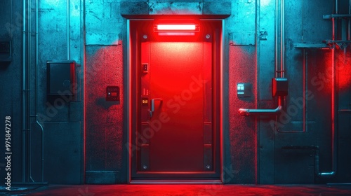 A red door is lit up in a dark room