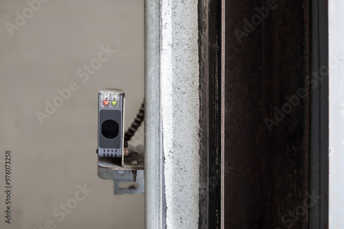 Garage gate sensor mounted on wall. Close up of photoelectric sensor with connected to overhead sectional door in parkade. Safety equipment for detection and prevention of accidents. Selective focus.