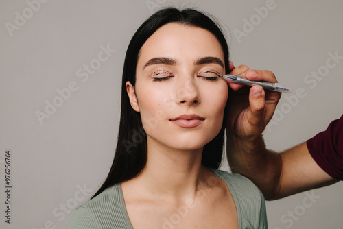 Surgeon is planning upper blepharoplasty with marker. Surgeon is drawing marking lines on eyelid of patient to have accurate operation.