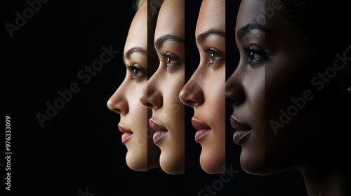 Portrait of four diverse women with side profiles against a black background. Emphasis on individuality and unity.