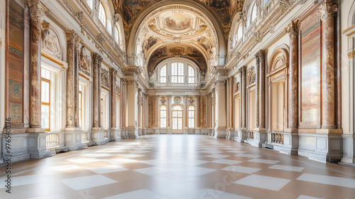 Ornate historic ballroom with grand arches, intricate frescoes, and large windows allowing natural light to illuminate the spacious interior.