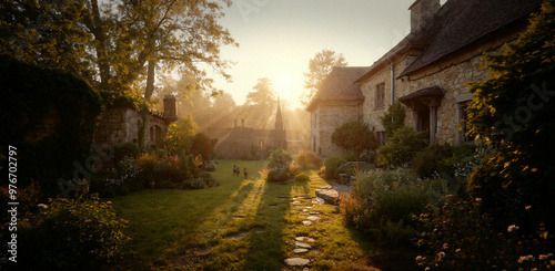 Średniowieczny ogród parkowy w porannych promieniach słońca. Piękne średniowieczne budynki, pałace, kościoły i domy ukryte w tajemniczych zaroślach.