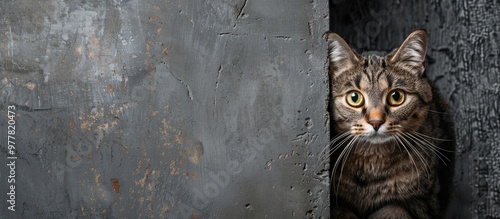A cat was concealed by the wall its large round eyes fixed on something. Copy space image. Place for adding text and design