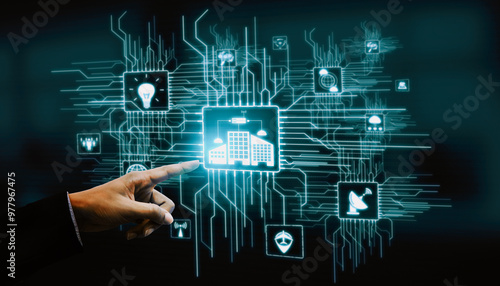 Internet of Things and Communication Technology Concept - Modern graphic interface showing smart information and digital lifestyle in application software for home and business use. uds