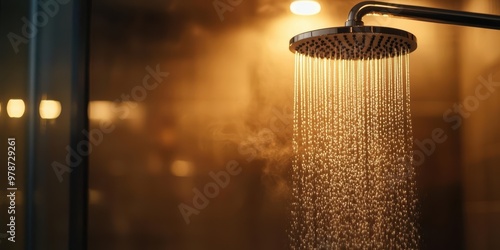 A close-up of a modern showerhead with water cascading down, creating a relaxing ambiance in a beautifully designed bathroom.