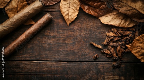 A detailed arrangement showcases a cigar beside a small pile of dried tobacco and leaves on a weathered wooden surface, highlighting the textures and colors of the materials