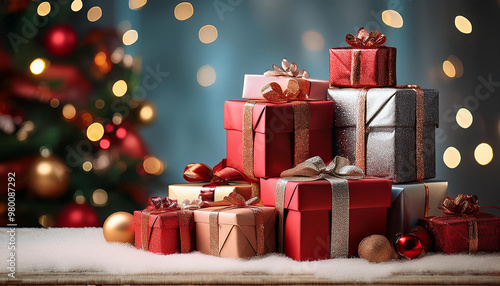 ラッピングされたクリスマスプレゼントがたくさん積まれている