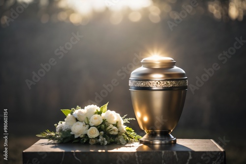 Gold Funeral Urn with White Rose Bouquet in Soft Sunlight