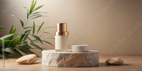 Elegant stone and wood pedestal showcases a naturally presented cosmetic product on a trendy minimalist background, perfect for beauty product promotion and display.