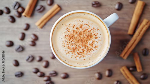 A beautifully crafted latte topped with sprinkle of cinnamon sits in white cup, surrounded by coffee beans and cinnamon sticks, creating warm and inviting atmosphere