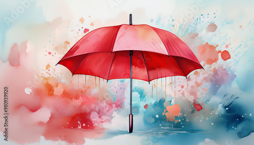Czerwony parasol, jesienna aura, akwarela generative ai