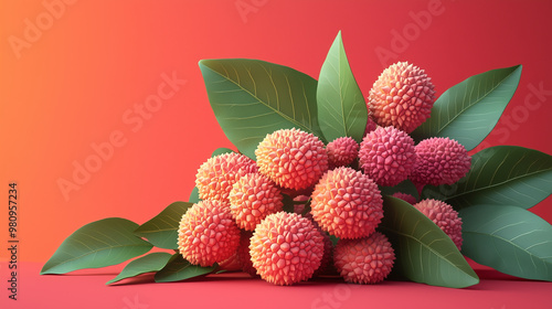 A vibrant bunch of lychees surrounded by lush green leaves, set against a bold red background, showcasing their unique texture and color.