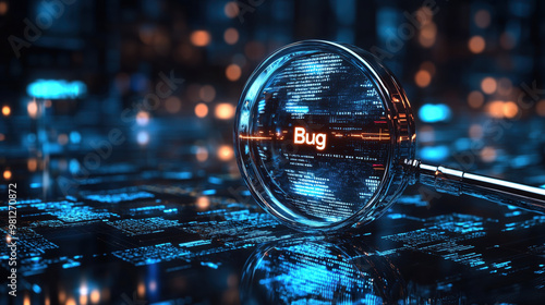 A magnifying glass reveals bug in code, highlighting importance of debugging