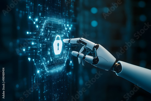 Robotic hand interacting with digital lock, AI cybersecurity, futuristic technology, data protection, secure network, cyber defense, artificial intelligence security, digital safety, secure system