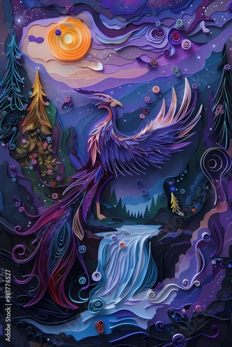 Detailed Paper Quilling Phoenix in Front of a Sunset