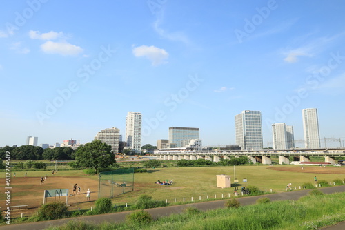 多摩川の河川敷から見る二子玉川駅周辺の風景