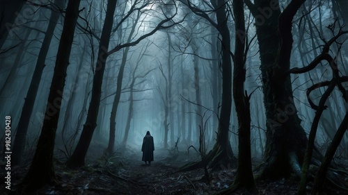 A shadowy figure looms in the depths of a thick, misty forest, concealing its skeletal form behind gnarled trees.