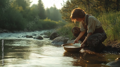 gold rush era person panning for gold in a river, highlighting the outdoor adventure and wilderness exploration of the time