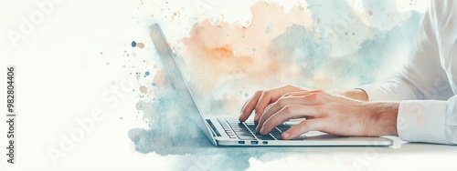 Closeup watercolor illustration hands using laptop computer and internet, typ on keyboard, search information, browsing. Freelancer copywriter working project, typing text, edit. Remote job concept