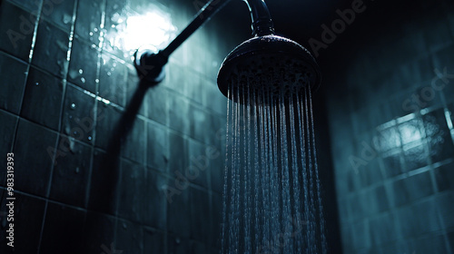 Shower Head: Position a sleek, black shower head with cold water running, creating a stark contrast against the dark surroundings.