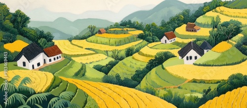 Lush green and yellow rice terrace fields on rolling hills featuring clay houses in a typical rural landscape