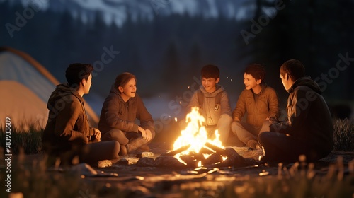 Campfire Tales: A group of friends gather around a crackling campfire, bathed in the warm glow of the flames, sharing stories and laughter under the starlit sky.