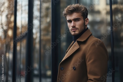 Portrait of young handsome stylish man in elegant coat. Outdoor fashion portrait.