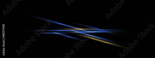 Blue yellow crossing laser beam, glowing speed line isolated. Techno designer elements, thunder bolt vector eps . Neon rays on black background. Overlay abstraction banner
