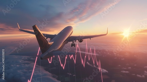 An airplane lifting a financial graph into the sky, symbolizing the growth potential of an airline acquisition.Aviation industry, strategy, investment, success,corporate strategies, economic growth.