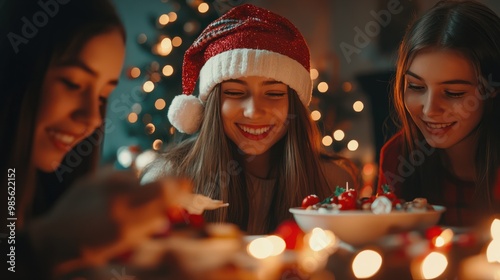 Christmas and new year sweets at home party of young friends having fun eating together at evening comeliness