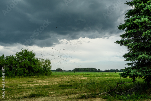 Duża granatowa chmura burzowa, ptaki odlatują przed deszczem, niepokojący krajobraz