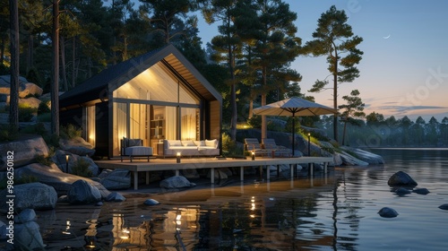 Modern 3D Rendered Cabin with Outdoor Seating by Scenic Lake Shore.