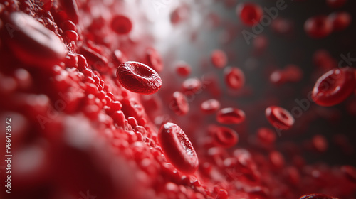 Czerwone krwinki w żyłach, płynące swobodnie w jednym kierunku. Zastosowanie głębi ostrości sprawia, że scena wydaje się żywa, a detale komórek są wyraźnie widoczne.