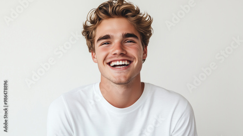 Młody mężczyzna z uśmiechem na twarzy, uwydatniającym perfekcyjne zęby. Zrobiony w profesjonalnym studio na białym tle, idealny do zastosowania w kampaniach reklamowych.