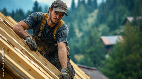 Mężczyzna na rusztowaniu pracuje nad wzmocnieniem drewnianych krokwi.