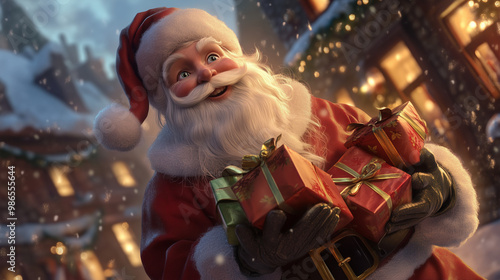 Święty Mikołaj z radosnym uśmiechem rozdaje prezenty dzieciom, które z niecierpliwością czekają w oknie.
