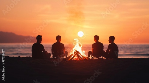 Silhouetted friends gather around a beach campfire at sunset, enjoying moments of warmth and connection by the ocean.