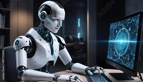 #1554131848Humanoid robot at a control panel in a data center, highlighting the integration of AI in data management