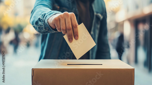 Zbliżenie dłoni wyborcy wkładającego kartę do urny wyborczej. Scena podkreśla odpowiedzialność obywatelską i udział w demokracji.