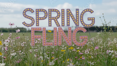 Pink and yellow spring fling sign in a field of wildflowers, joyful celebration of the season.