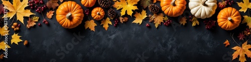 A festive autumn arrangement with pumpkins, leaves, and pinecones on a dark background.