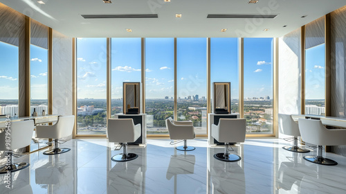 Przestronny salon z panoramicznymi widokami, gdzie klienci mogą cieszyć się nie tylko profesjonalnymi usługami fryzjerskimi, ale także pięknem otaczającego krajobrazu.